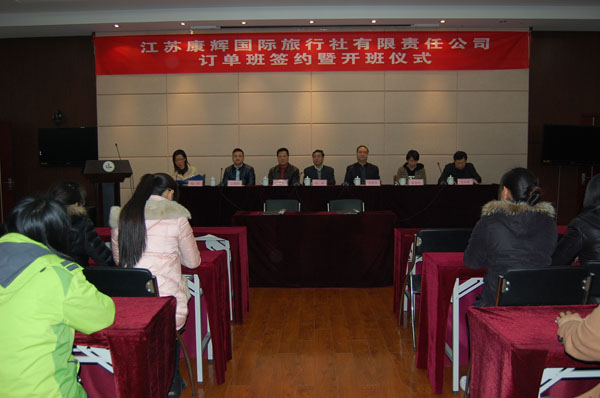 3月20日下午,必赢外语与旅游学院与江苏康辉国际旅行社有限责任公司订单班签约暨开班仪式在国际交流中心二楼报告厅举行。冯渊副校长、外语与旅游学院领导和康辉旅行社的相关同志及27名学员参加仪式。