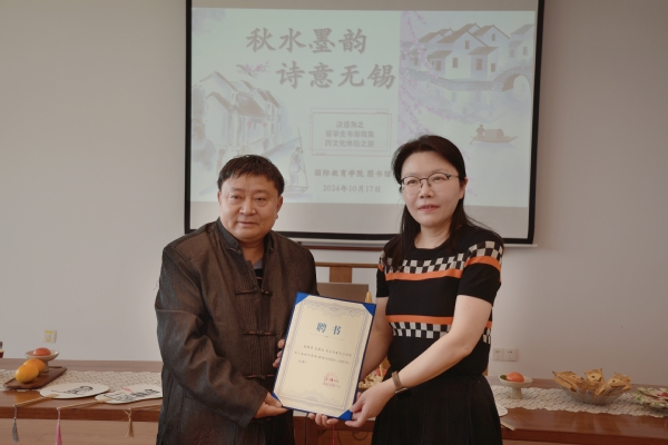 本次活动特别邀请了无锡古运河书画院协会成员吴国亚作为校外导师,吴慧媛颁发聘书。从本学期开始吴国亚将为留学生开展系列书画课程,讲授书法技巧,传播国画艺术,展示中华文化。