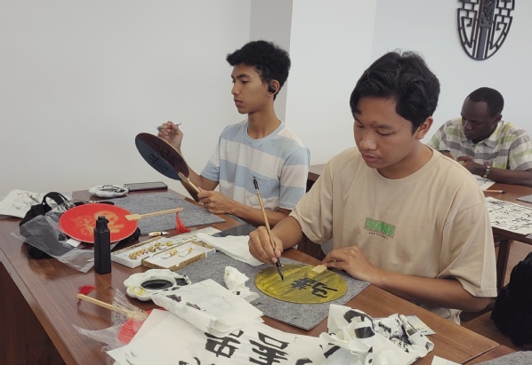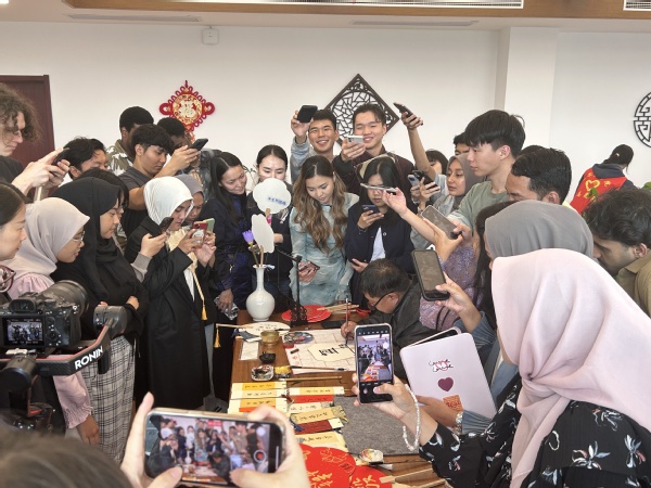 活动中,为了帮助留学生进一步了解中国传统文化,图书馆读者协会制作了以二十四节气为主题的画框赠送给留学生。随后吴国亚给留学生讲起了中国书画艺术、他与无锡的渊源以及创作的灵感,并现场展示花式福字扇面的创作过程,引得留学生称赞不已。现场各国留学生一起学习写汉字、画扇面、交流心得,既体验了中国传统文化的独特魅力,也对无锡当地文化特色有了更深的了解。