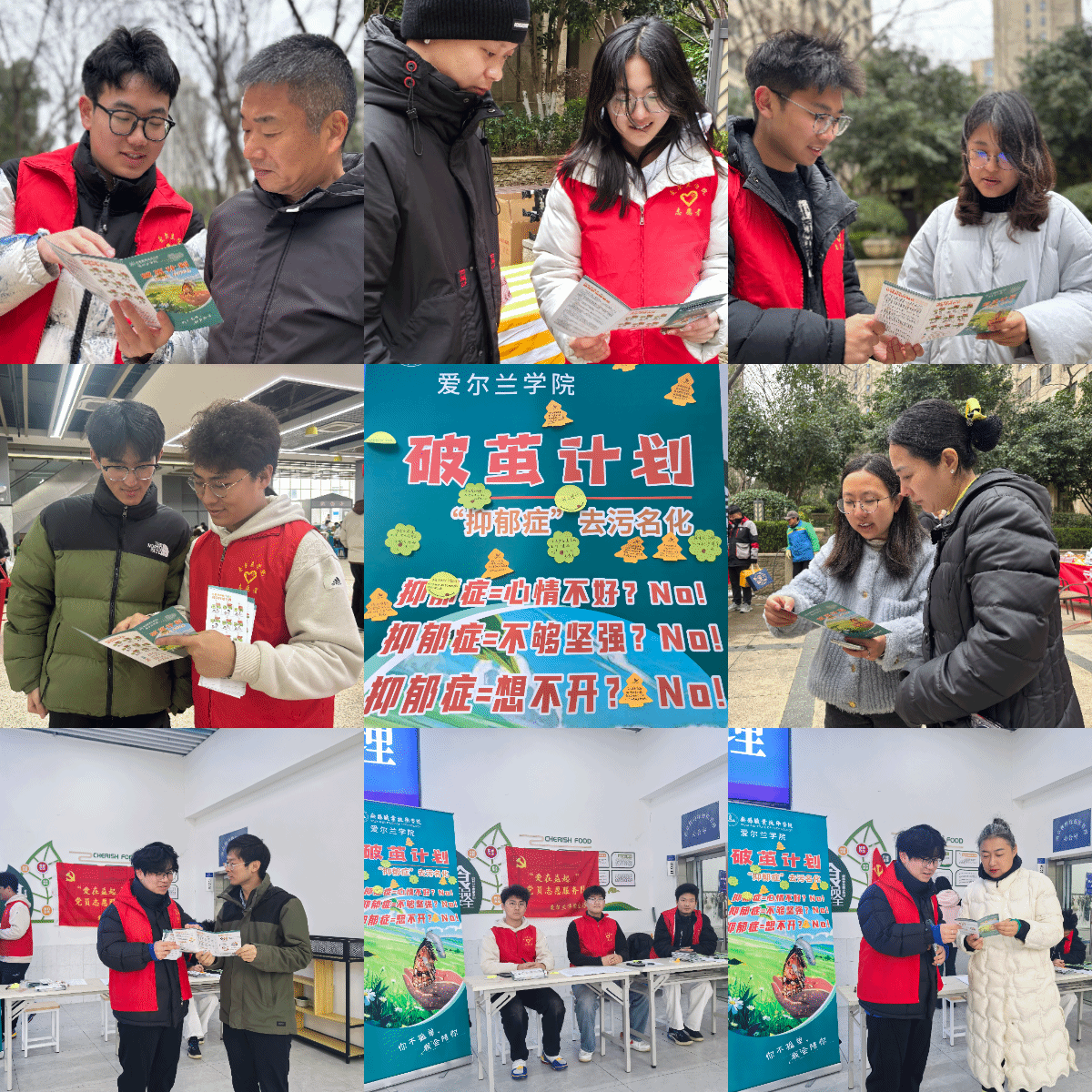3月4日至5日,爱尔兰学院“爱在益起”志愿服务队在学校和信成花园社区联动开展以“抑郁症去污名化”为主题的心理科普志愿服务“破茧计划”。