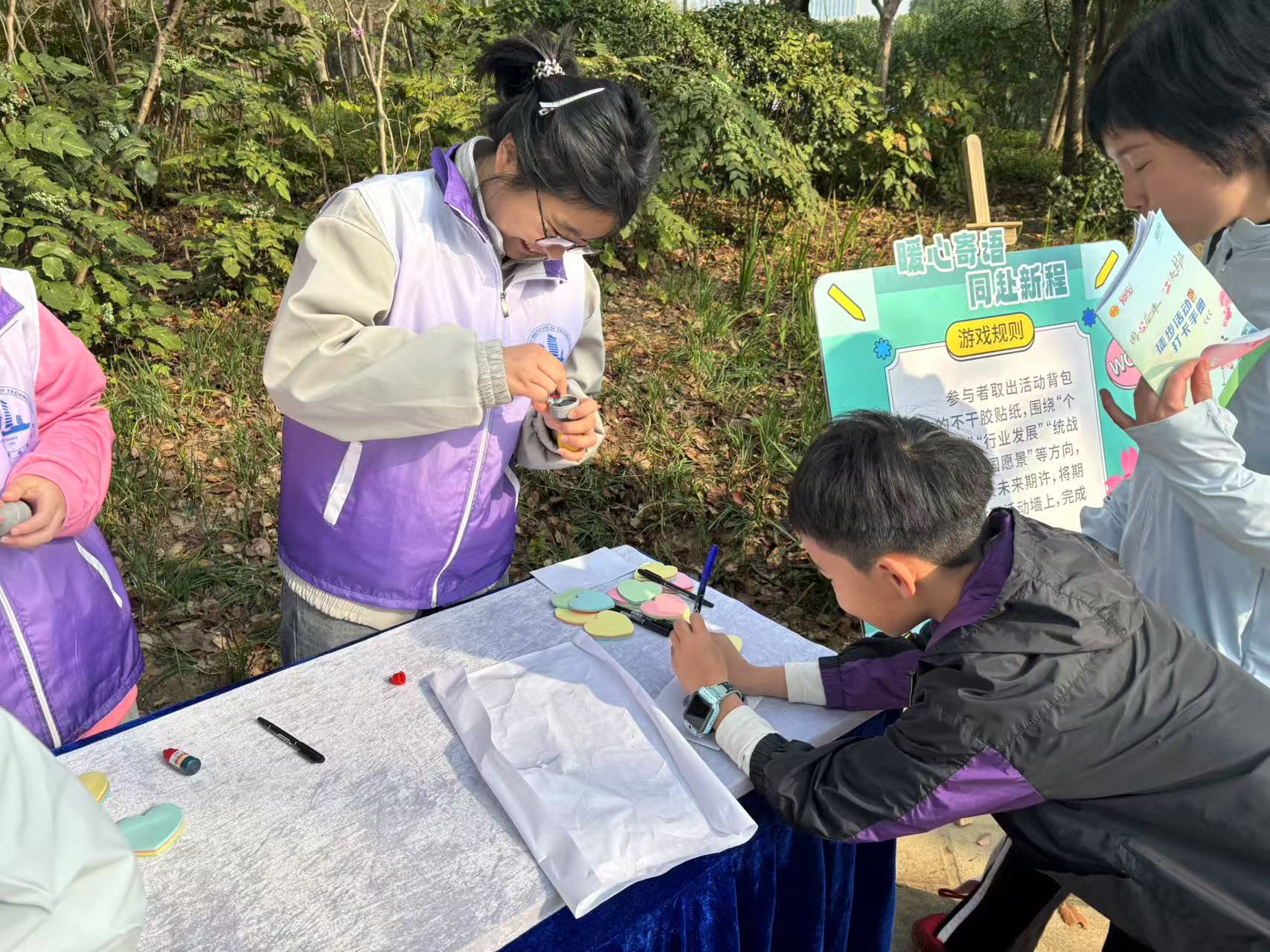作为无锡“太湖湾科创带”的重要载体,海归小镇以"集成电路+智能网联"为产业定位,其充满未来感的科创园区与毗邻的千年巡塘古镇形成鲜明对比。为保障这场大型活动顺利开展,志愿者们提前一周开展专项培训。他们反复勘察5公里徒步路线,在尚贤河湿地公园的曲径回廊、巡塘古镇的青石板路等关键节点设置6个服务岗,并设计以集成电路元素为主题的集章卡和互动游戏。在起点处志愿者们分工明确,各司其职,物资组的同学将定制帆布袋、矿泉水、急救包等物资分装完毕。在生态绿廊段,讲解组志愿者手持电子导览屏,为参与者讲述尚贤河湿地"海绵城市"的生态智慧;于巡塘古桥旁,历史组的同学以情景剧形式演绎古镇的千年文脉,用行动转化为服务社会的生动实践。志愿者集成电路24322班郑乐乐说:“每一次与徒步者的默契击掌,都迸发着携手共进的火花,在欢声笑语中解锁游戏印章及礼品。”