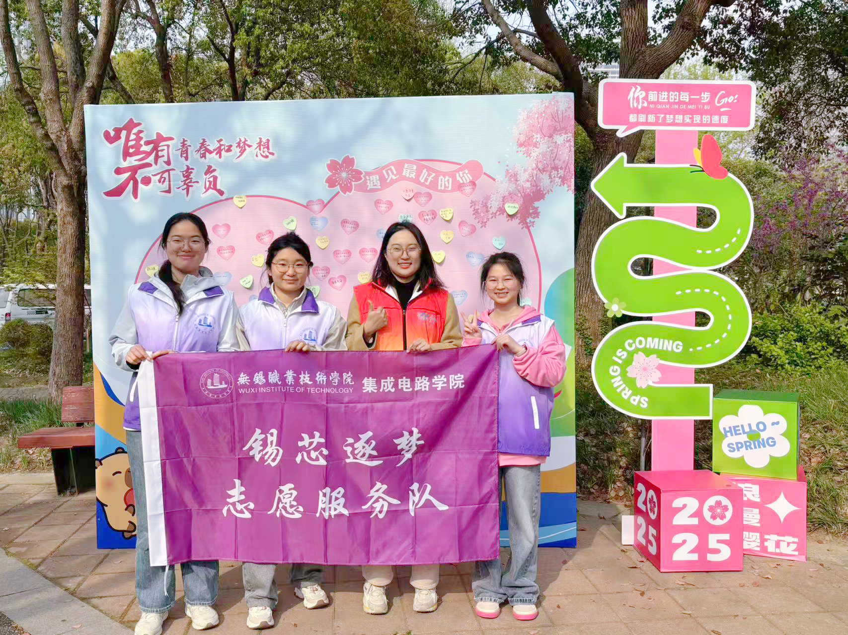 春云漫卷,幼叶新发。4月5日,在春意盎然的美好时节,由无锡经开区主办的“同心奋进 '工'赴新程”徒步活动在海归小镇正式启幕。集成电路学院“锡芯逐梦”志愿服务队的青年志愿者们身着统一紫色队服,以饱满热情投入到这场贯穿智慧新城与历史文脉的志愿服务中。