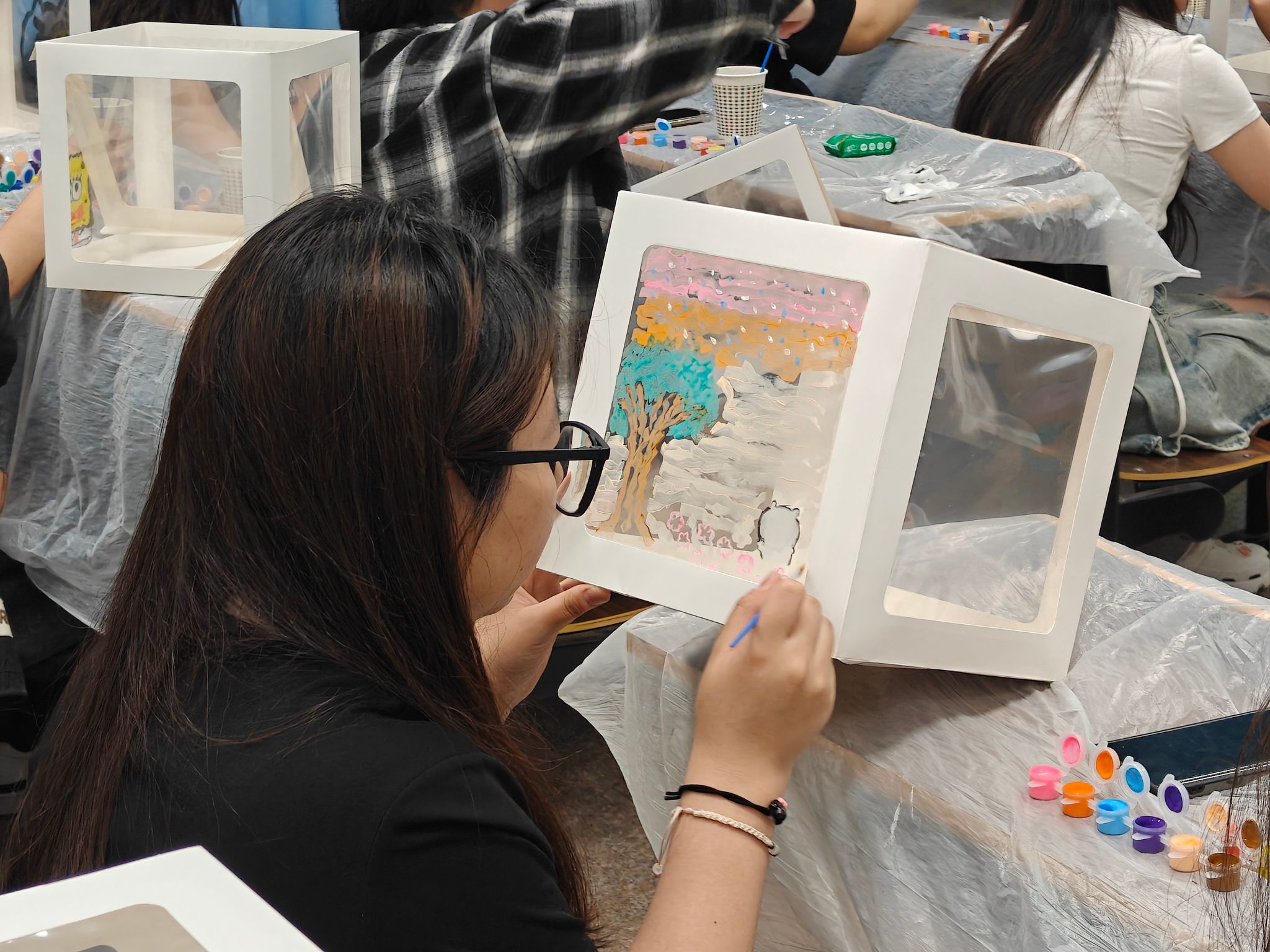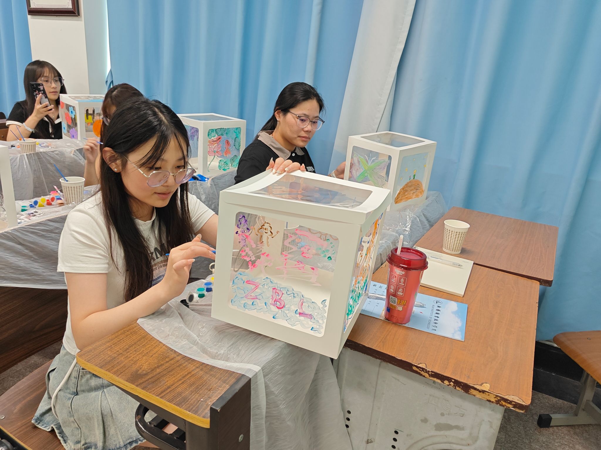 活动现场,同学们依据个人喜好,细致挑选心仪的颜色与图案,随后手持颜料、画笔等创作工具,全身心投入到透明箱子的绘制中。他们神情专注,目光紧紧锁定在手中的创作对象上,完全沉浸于属于自己的艺术世界,创意灵感如潺潺溪流般源源不断地涌现。部分同学运用明快鲜艳的色彩,勾勒出梦想的清晰轮廓,以灵动流畅的线条描绘出对生活的炽热热爱与美好向往,每一笔都仿佛在热情地拥抱生活的每一处精彩;而另一些同学则选择深沉的色调,将心底的秘密悄然倾诉,把内心的忧愁与烦恼融入那一抹抹深邃而富有层次的色彩之中,在细腻的涂抹过程中,实现了与内心烦恼的和解。