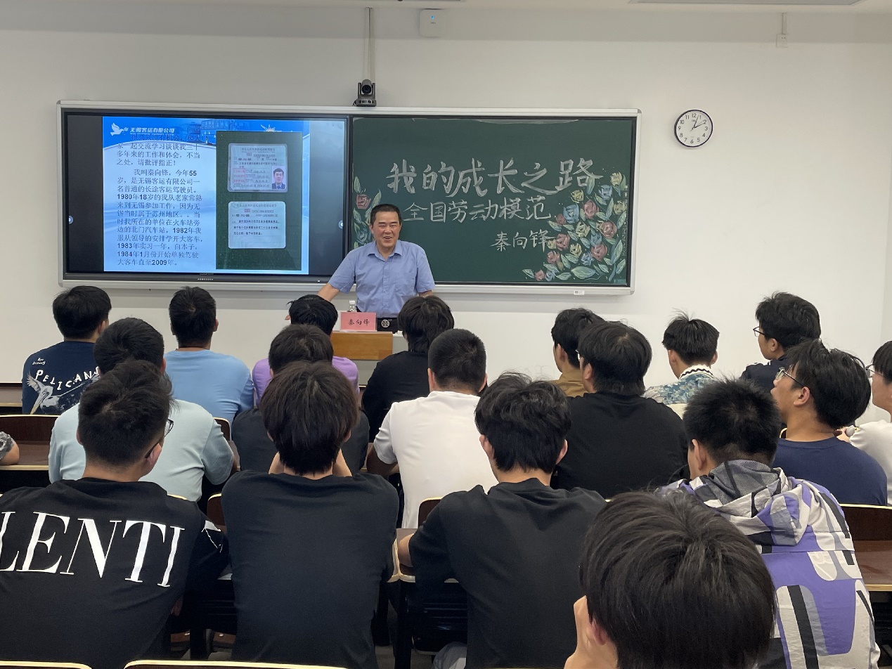 讲座由双创学院党总支书记朱倩主持。秦向锋通过一系列珍贵的照片和生动的文字介绍,让青年学子走进他丰富多彩的职业生涯。秦向锋自刚成年的年纪就来到无锡客运集团,从一名普通的驾驶员做起,凭借对工作的无限热爱与执着追求,逐步成长为行业内的标杆人物。他将这段成长经历概括为一句古诗,“宝剑锋从磨砺出,梅花香自苦寒来。”他几十年如一日,坚守在客运一线,用实际行动诠释了何为匠心精神。