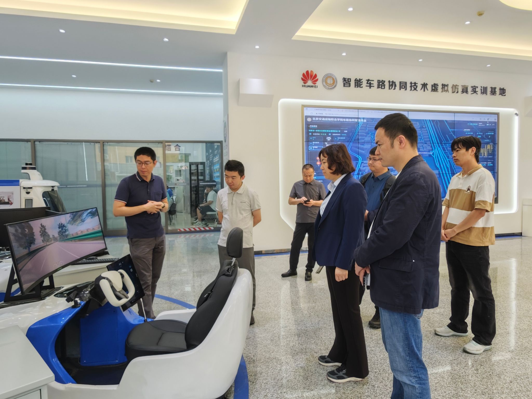 在北京交通运输职业学院,调研组参观了该学院与四合天地合作开发的智能车路协同技术虚拟仿真实训基地,深入了解“车路云网图”智能网联汽车方案和相关产业链人才培养模式。三方围绕智能网联汽车、人工智能等专业方向的人才培养进行了深入交流。
