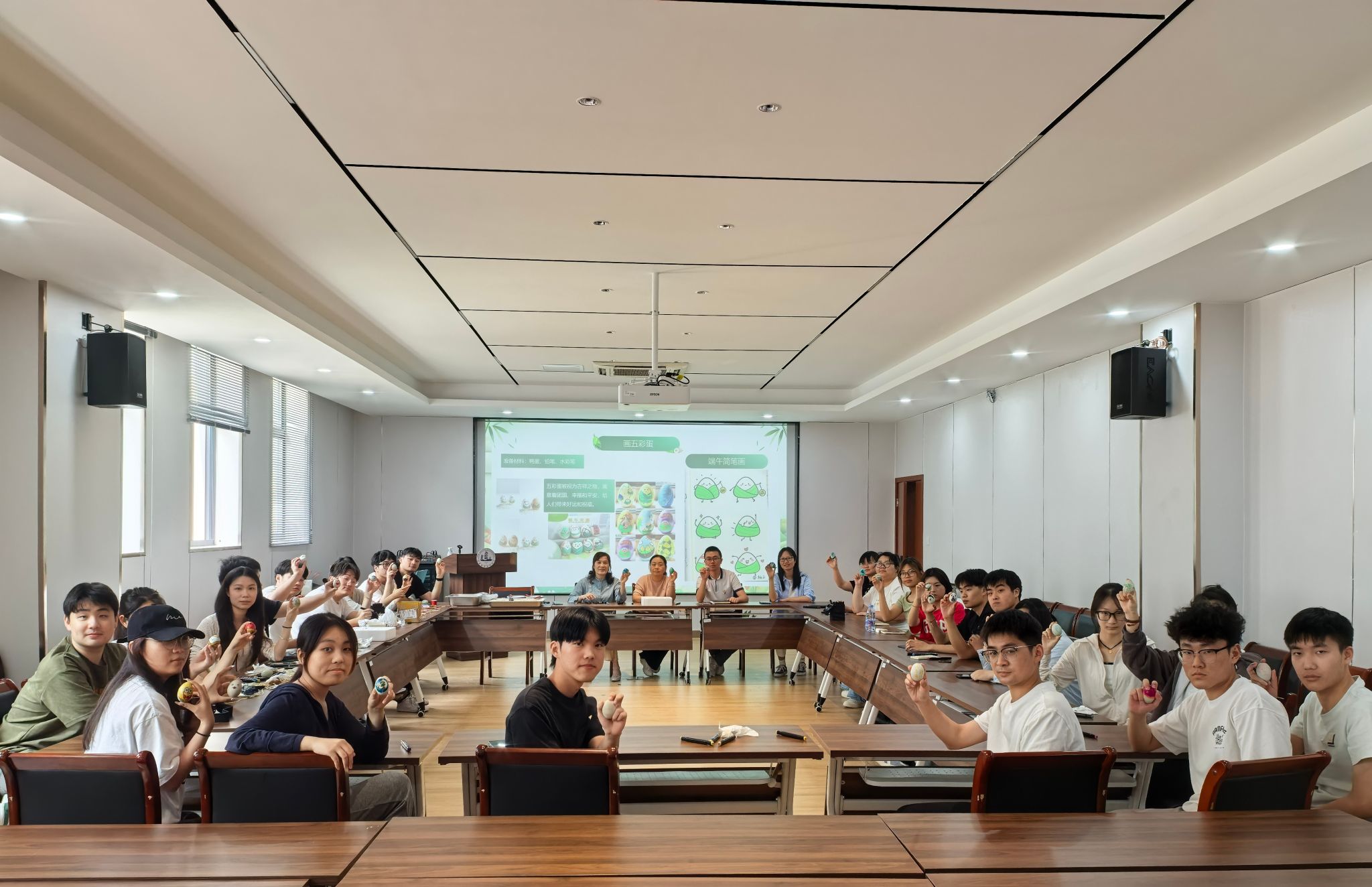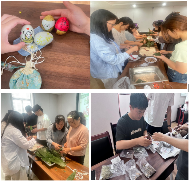 活动在主持人的简短介绍中拉开帷幕。现场,学生们围聚在摆满糯米、红枣、粽叶的桌前,与老师共同交流包粽子技巧。关工委徐金凤老师耐心指导学生将节日祝福包进一个个饱满的粽子,既体验传统氛围,又掌握实用技能。香囊制作环节中,熟悉中药的孙仲磊同学为在场师生仔细讲解丁香、白芷、艾草等各类中药材驱虫安神的具体功效,并分享防蚊虫、安眠、端午安康等三种配方,香囊成品的淡淡芳香弥漫现场。此外,大家用象征吉祥的五色丝线彩绳,亲手编织出承载祝福的手工艺品;师生们共同在鸭蛋上绘制龙舟、粽子等端午元素,将各类创意融入五彩蛋画,让传统文化在奇思妙想中焕发新生。参加活动的同学感慨道,“通过亲手包粽子、编彩绳、制香囊、绘彩蛋,在场师生感受到的不仅是节日的欢乐,更是文化血脉的延续与传承。”