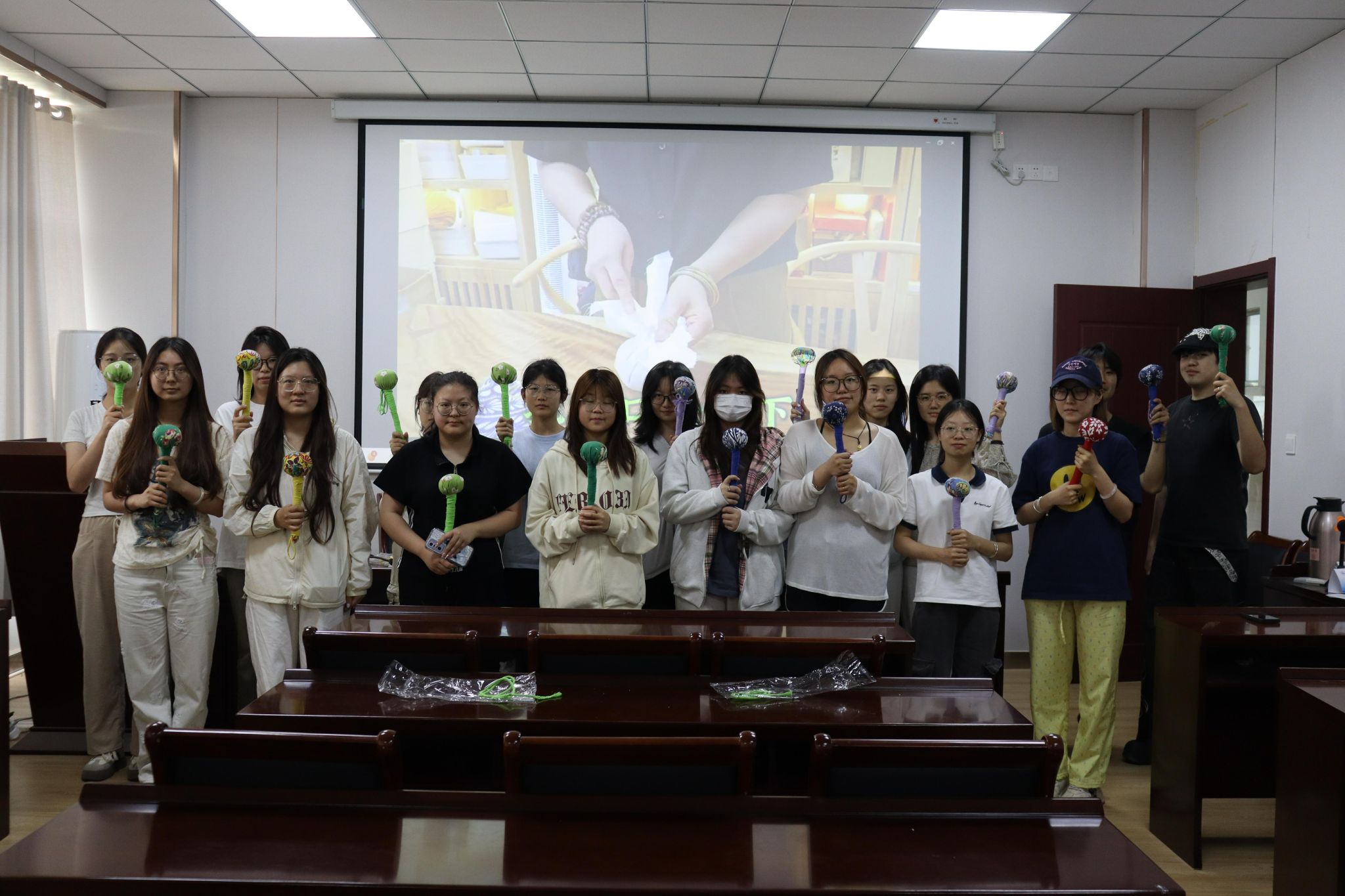 活动开始,指导老师强英诞为同学们揭开了艾草锤的文化面纱,讲述了艾草在端午节驱邪避疫、祈求安康的悠久习俗,更深入浅出地阐释了艾草锤蕴含的中医养生智慧——其温和的捶打能有效舒筋活络、缓解疲劳,是古人将自然馈赠与健康理念完美结合的体现。随后,大家共同观看艾草锤制作的教学视频。视频中详细展示了艾草锤的制作步骤与技巧,从锤子的组装到装饰,每一个环节都清晰明了,为后续的制作环节打下了坚实的基础。观看过程中,大家聚精会神,对即将亲手制作的艾草锤充满了期待。