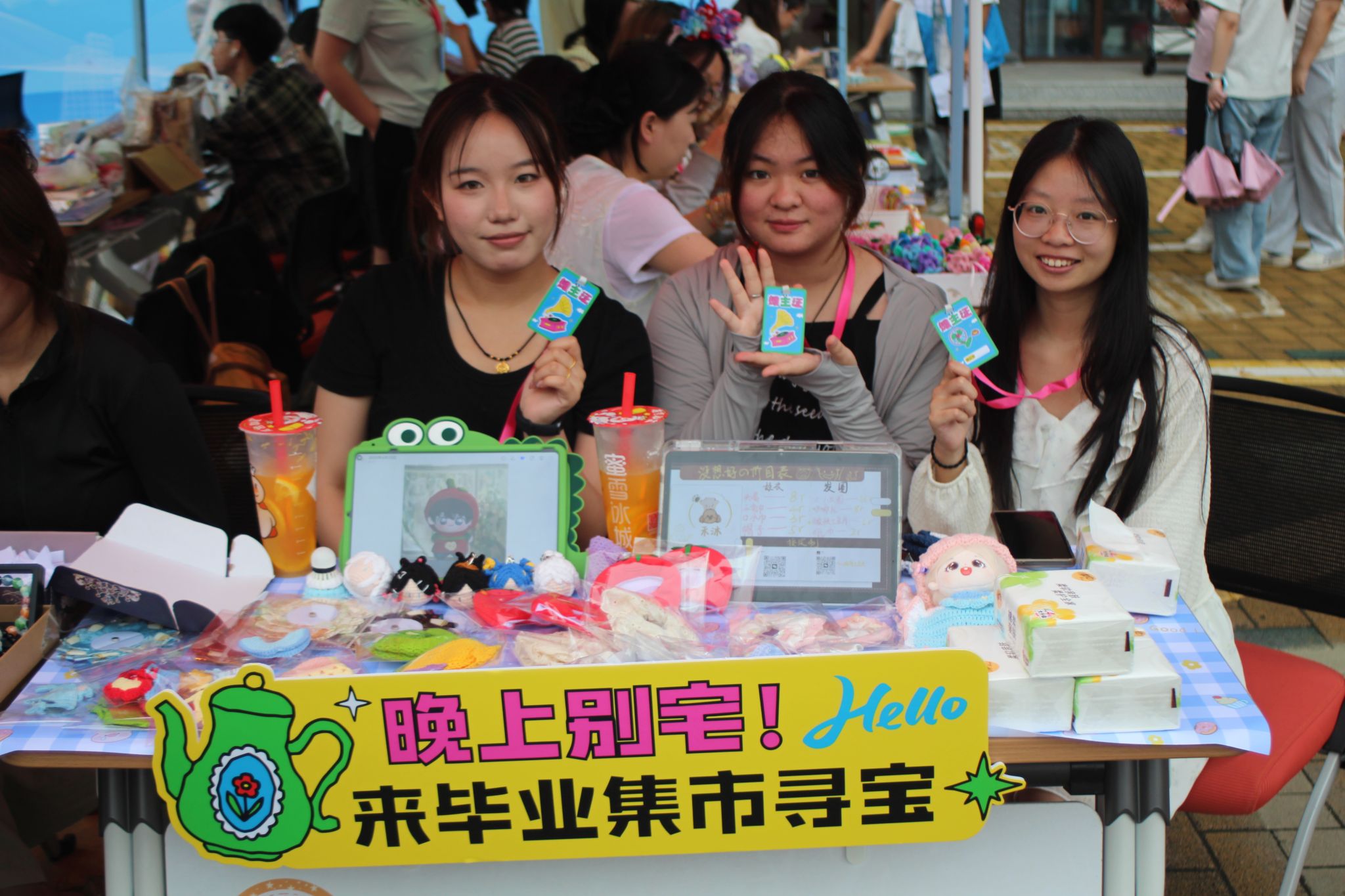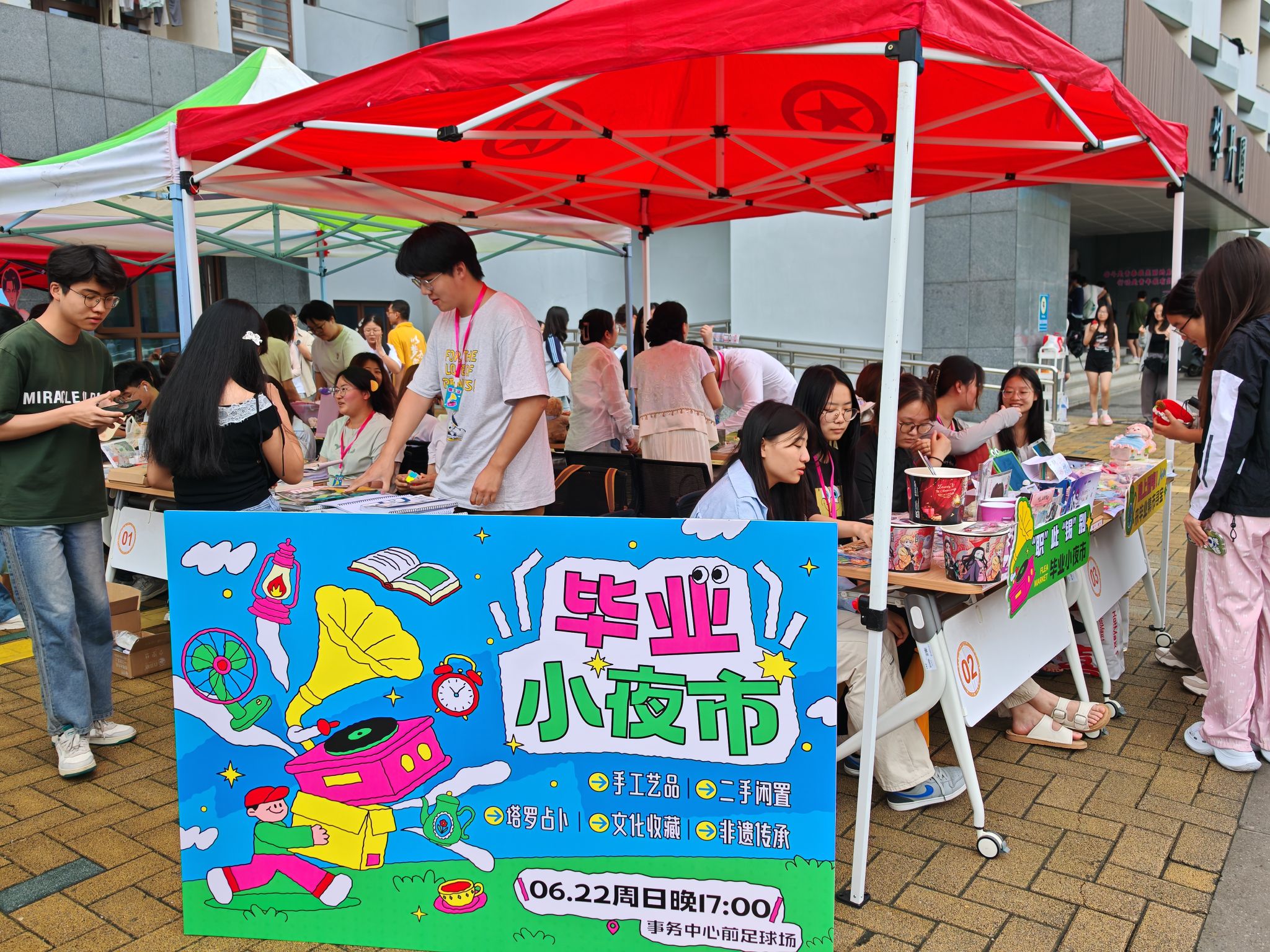 活动现场,学生事务中心门口化身为承载青春与趣味的微型社区。各式摊位在绿荫下铺展开来:一边是琳琅满目的二手商铺,毕业生们悉心陈列着陪伴自己多年的书籍笔记、生活小物和珍藏纪念品,每一件旧物都仿佛在讲述一段校园故事,吸引着学弟学妹们驻足挑选,讨价还价间流淌着同窗情谊与传承的温度;紧邻其旁,手作工艺品区则簇拥着赞叹的人群,毕业生和在校师生们巧手制作的书画扇、编织、饰品等创意作品在阳光下熠熠生辉,传递着匠心与热爱;而在场地一隅,塔罗占卜则弥漫着些许轻松神秘的气息,好奇的毕业生们在趣味互动中体验片刻的“心灵对话”,为毕业季增添了一抹别样的色彩和会心一笑的瞬间,共同构成了这场告别仪式中关于分享、创造与轻松体验的独特注脚。
