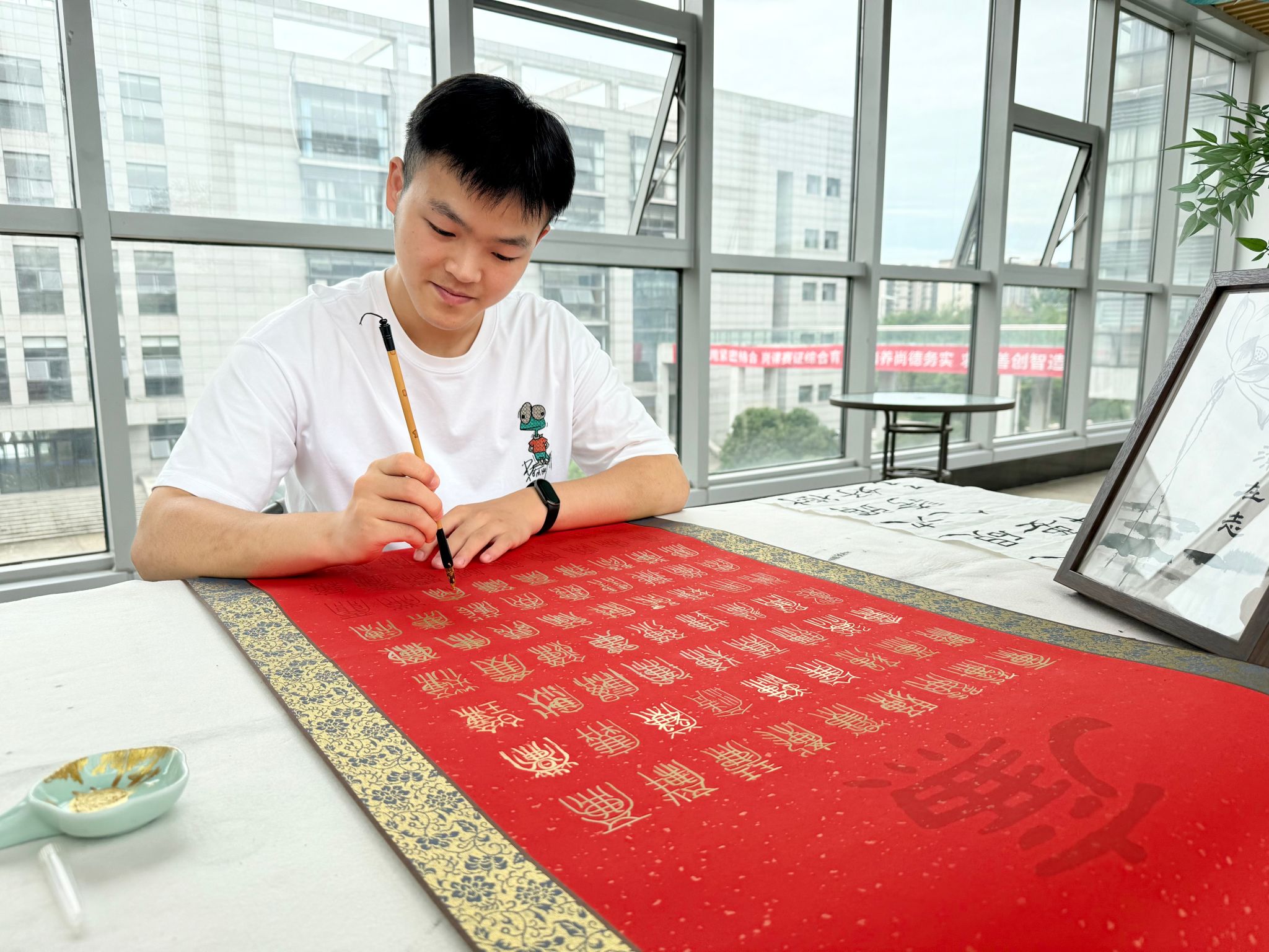 此次展览汇聚了众多学生精心创作的廉洁文化佳作,作品形式丰富多样,涵盖了书法、绘画、剪纸等多种艺术门类。其中,一幅女书版《爱莲说》格外引人注目。该作品巧妙地将传统廉洁诗文与非物质文化遗产“女书”相融合,以独特的女性文字生动诠释了“出淤泥而不染”的高洁品格,为师生带来了一场跨越时空的文化对话。书法作品笔力雄浑、刚劲有力,书写者以名言警句为载体,大力弘扬清廉正气,彰显了廉洁文化的深厚底蕴。绘画和剪纸作品则凭借生动的意象,细腻地展现了廉洁自律、崇德向善的精神风貌,让观者在欣赏艺术之美的同时,深刻感受到廉洁文化的独特魅力。