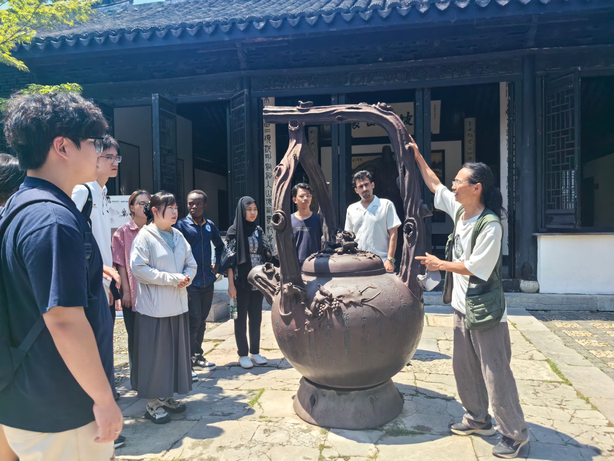在宜兴陶瓷博物馆,中外学生开启"紫砂溯源"之旅。从紫砂泥料种类、制作流程、工艺和工具、名人大家、历代精品等方面的学习和观摩,团队成员们感受到宜兴紫砂历经数百年的传承与发展,是历代匠人、文人的智慧结晶,蕴含着时代的风尚,绽放着艺术的光芒。一代代艺人名匠的汗水浸润泥沙,用心血成就精工。中外学生从中感受到"天人合一"的造物哲学与"匠心独运"的精神内核。留学生乐天表示:"紫砂壶的每一道纹路都藏着东方智慧,这让我对'中国式工匠精神'有了具象认知。"