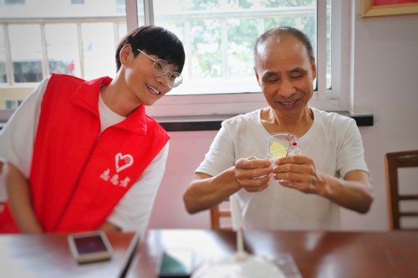 除了团体心理辅导活动,实践团师生还充分发挥艺术设计专业特长,探索“艺”“心”融合、“以艺润心”的多元化活动形式。学生志愿者以“二对一”的帮扶形式,共同完成非遗漆扇、干花书签、艺术相册等手工制作,感受传统文化的艺术魅力。一个个富有生命力的艺术作品巧妙呈现了残友们丰富的内心世界和情绪感受,他们迫不及待地展示作品,与队员们合影分享。小郑听力受损,动手能力却很强,平日里话不多的她在活动中格外健谈,她告诉志愿者,做手工的过程让她感受到了内心的平静与能量的流动,非常治愈,她很享受这样的松弛感。