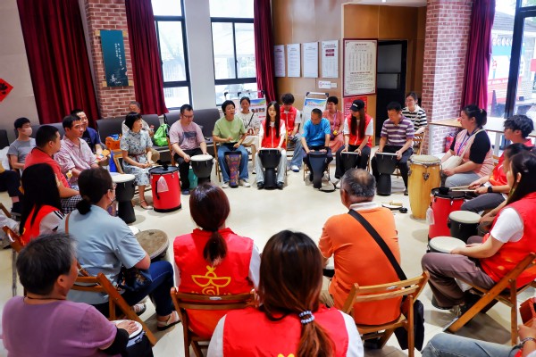 在谈渡桥社区立心园残疾人之家开展的鼓圈团辅活动,成为了志愿活动的一道亮丽风景线。队员们带着残友围坐成圈,在雨点变奏曲的热身活动下逐渐放松。随着鼓声和节奏的融合,队员们以不同的分组和塑型方式进行引导。在轻松自由的氛围下,残友们尽情地敲响手中的非洲鼓和小打乐器,享受同频共振的心灵疗愈。在队员们的鼓励下,残友们纷纷来到鼓圈中间,用拍球、跳圈等创意方式体验节奏引导,现场回荡着欢快而丰富的旋律。