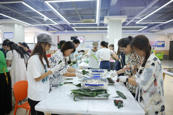 活动现场,餐厅工作人员早早把泡好的糯米、粽叶、红豆、蜜枣、葡萄干、粽叶、棉绳等材料整齐地摆放到位,师生们纷纷动手,从折粽叶、填糯米、裹叶子到扎线,每一个步骤都显得有条不紊,一个个形态各异的粽子在他们的巧手中诞生。粽叶的清香和糯米的甜香交织在一起,营造出浓厚的节日氛围。许多师生都是第一次包粽子,看着自己亲手包好的粽子,成就感油然而生。