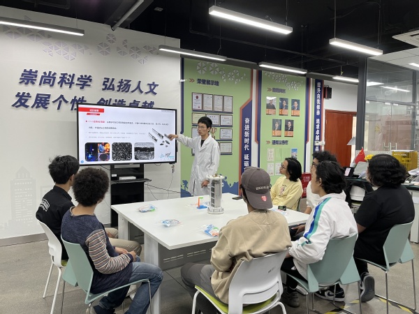 硼碳科技团队负责学生邹西壮、曹娜带领留学生们参观了实验室环境,详细介绍了难加工切削与装备应用实验室创立历史,向留学生们展示了实验室研究成果,并用通俗易懂的语言深入浅出地介绍了掺硼金刚石BDD电极的结构、特点及处理废水的工作原理。为了更好让留学生们深刻感受科技魅力,团队同学带领完成了溶解过滤DIY科学小制作,在场留学生们通过体验、组装、实验,体会了乐趣和自己动手的奥秘,现场交流气氛热烈。