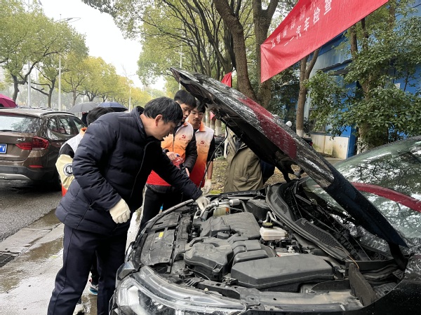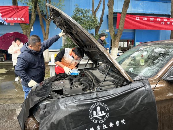 活动在汽车工棚开展,汽车学院全体师生党员、入党积极分子参与其中。根据车主对爱车问题的介绍,师生分工协作,运用专业知识开展技术服务。虽然天降大雨,但参与此次志愿服务的全体师生党员没有落下一个步骤,检修、维护、保养等每一个看似简单的环节,都做到精益求精,他们的专业技能和暖心服务得到车主们的一致好评。