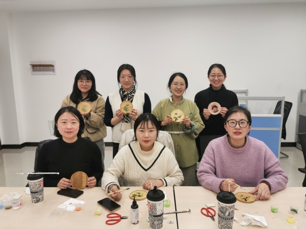 掐丝珐琅是非物质文化遗产宝库中的瑰丽,在专业指导下,老师们用灵巧的双手把柿子、铃兰花等图案仔细地根据传统工艺的要求在木质杯垫上仔细掐出形状,再用珐琅颜料逐一上色,制作出一个个精美且寓意美好掐丝珐琅杯垫。在制作的过程中,大家感受到了传统工艺的神奇与绚丽。