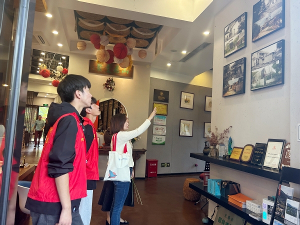 在社区负责人和老师们的带领下,同学们沿着嶂青幸福湾休闲景观带参观,感受无锡市美丽乡村示范村的乡土文化。沿途中,同学们深入果园,体验山楂采摘的乐趣,感受“民宿集聚村”嶂青的品牌。走进茶园、品茶香、探茶趣,茶厂需要机器研发人员根据茶品非标定制的机器,让机器人专业的胡董兵认识到工人机器人专业在农业领域也可以大有作为。
