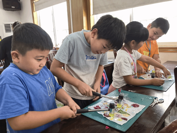 在心理活动之余,队员们还充分发挥艺术设计的专业优势,带领孩子们开展“探索植物拓染,感受非遗之美”拓染活动。通过互动问答的形式,队员向孩子们介绍了非遗在技艺传承和文化传播中的重要意义。在了解了拓染的原理和步骤后,大家开始挑选花叶、盐水浸泡、摆放定形、敲打成型。“叮叮当当”、“咚咚锵锵”,现场气氛热烈高涨。孩子们拿着自己独一无二的拓染成品,迫不及待地与队员们分享自己的作品。