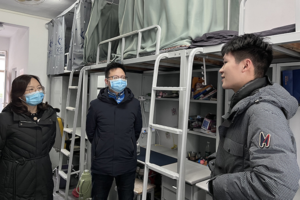在走访大一、大二年级宿舍的时候,徐进关心、询问同学们有关寒假的收获和体会、新学期的学习计划等情况,提醒同学们要尽快调整学习状态,合理规划新学期生活,同时要适度加强体育锻炼,养成良好的作息习惯,做好个人健康的管理,以饱满的热情投入到新学期的学习生活中去。老师们特别提醒要提高安全防范意识,注意防火、防盗、防诈骗和宿舍用电安全。