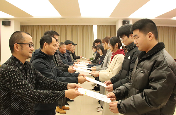 学院关工委刘德强老师宣读2022年度“成长进步奖”表彰决定。全体关工委组成人员和老同志们为获奖学生颁发了荣誉证书并合影留念。