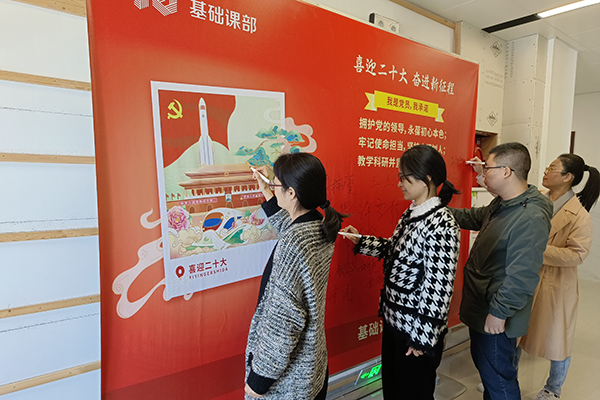 10月11日下午,支部全体党员教师在党旗下庄严宣誓,并郑重承诺:拥护党的领导,永葆初心本色;牢记使命担当,坚持立德树人;教学科研并重,共圆强校之梦。之后,在校长周桂瑾的带领下郑重签名。大家纷纷表示,承诺签下的是一个名字,更是一份共产党员的责任和担当,在今后的工作生活中将以实际行动践行承诺。值得一提的是,基础课部的非党员教师得知此事后,也积极在展板上签上了自己的名字,表示要和党员们一起,共迎二十大。