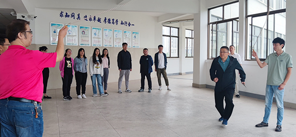 全体老师齐聚在明德楼B三楼大厅,熟悉跳绳规则,自由组合成10人的队伍,兵分三路开始练习。随后,在发令、计数人员的引导下,每一队教师由2人摇绳,其余8人在规定的时间内完成跳绳接龙。随着练习的深入,老师们动作越来越娴熟,身姿越来越轻巧灵活,队友之间的配合越来越默契,活动现场一片欢腾。