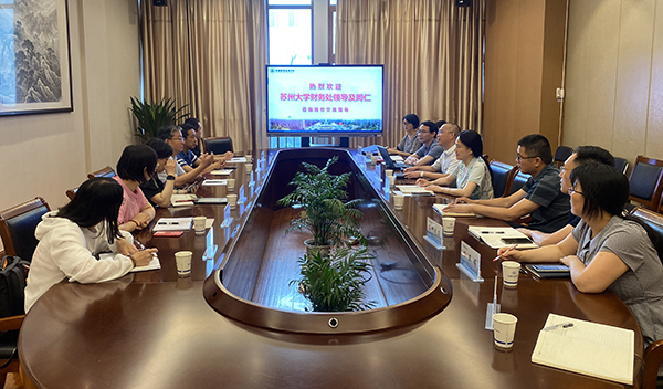 6月28日上午,苏州大学财务处处长陈永清一行莅临必赢调研交流,必赢副校长强伟纲、财务处、资产处相关负责人在综合楼F204会议室热情接待来访人员。