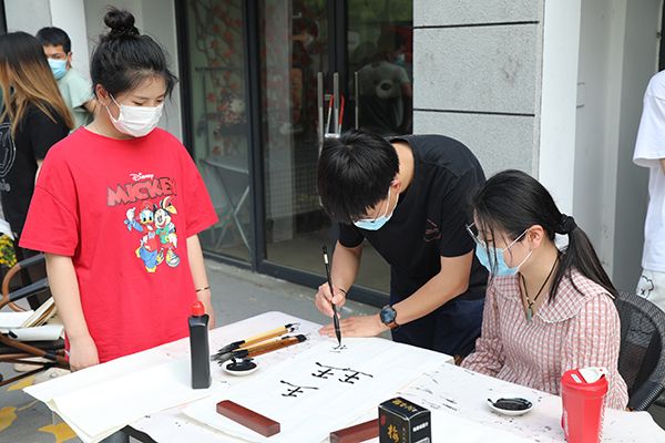 来自两个社团的同学现场进行了作品创作展示,引来许多学生驻足欣赏。在志愿者的认真讲解、亲笔示范下,同学们在临摹中体验了书法和绘画的乐趣。