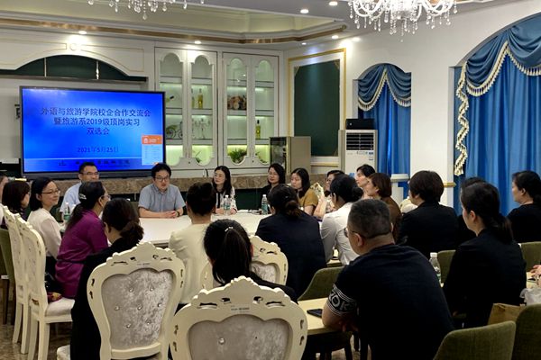 校企合作交流会现场,外语与旅游学院院长冯臻及旅游系全体教师共同出席了本次交流会,与到会的23位企业专家共同交流人才培养,共商校企合作事宜。