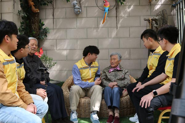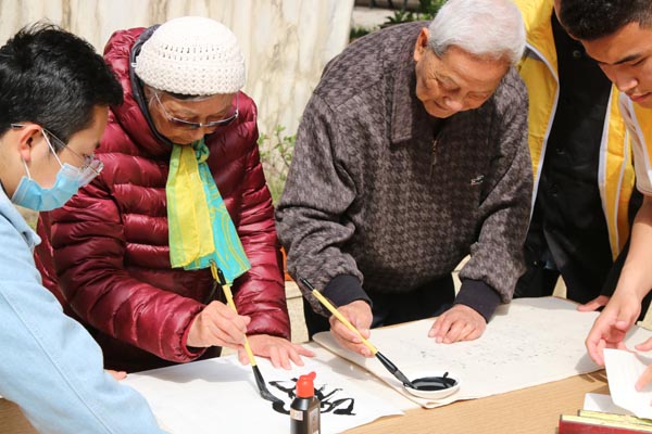 志愿者们帮助老人清理卫生,整体内务,并和他们一起做养生操,还精心准备了文艺演出,演奏二胡名曲《赛马》、演唱抒情歌曲《父亲的散文诗》及合唱《国家》来叙述祖国的繁荣昌盛。在现场的互动环节中,几位热爱书法的老人主动要求为志愿者们展示了书法作品,表达了对祖国的美好祝愿。志愿者们的话剧表演《破晓》,生动展现了五四运动期间,青年学生保家卫国视死如归的场景,学生志愿者们生动的演绎感染了在场的每一位老人,有不少老人情不自禁的跟着一起挥拳、抹泪,令人动容,受到敬老院上下一致好评。