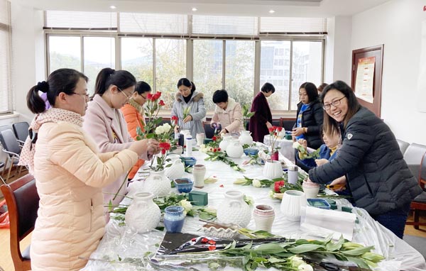 分工会提前采购了一批清幽绝俗、高雅活脱的鲜花,为插花品香会做好准备。3月9日下午,女教工们齐聚一堂,在欣赏完插花技巧示范视频之后,她们以花草为媒介,一盆盆超凡脱俗、精美绝伦的鲜花在她们灵巧双手的塑造下应运而生。男教工们则根据自己的审美为女教工们的插花投上了宝贵的一票。