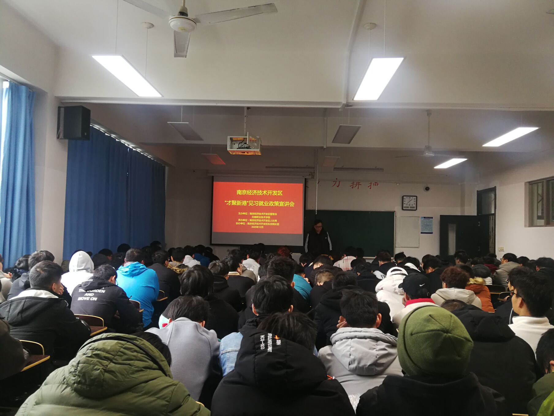 2月1日下午,南京市经开区“才聚新港”见习就业政策宣讲活动在必赢教三209教室成功举办。来自南京经开区人社局的14名工作人员到场为同学们开展了到宁工作的政策宣讲,汽车与交通学院2018级300多名同学分两个批次参加了该宣讲活动。活动现场,南京经开区人社局肖主任从见习申报条件、见习时间、补贴标准、报名流程、注意事项等方面对南京地区见习政策进行了全面解读,并从就业创业环境、就业支持政策等方面具体介绍了南京经开区的就业优势,向2021届汽车与交通学院毕业生发出了诚挚的就业邀请。