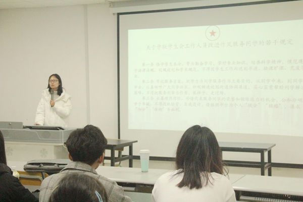 辅导员林姣姣带领团学干部学习《学联学生会工作人员改进作风服务同学的若干规定》
