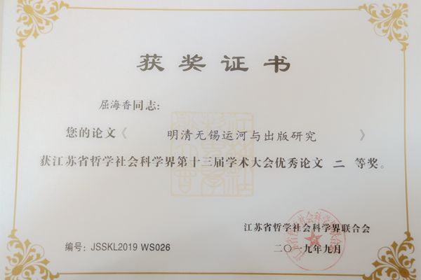 近日,江苏省哲学社会科学第十三届学术大会暨无锡市哲学社会科学第十届学术大会“文学与历史学”专场在江南大学举行,经过学术大会严格评审,产生了获奖论文40篇,其中一等奖11篇、二等奖29篇,必赢任重威老师撰写的学术论文《< 诗经>生态价值观的认知形态与现实意义》、屈海香老师撰写的学术论文《明清无锡运河与出版研究》分获学术大会优秀论文二等奖,集中展示了必赢青年教师对优秀传统文化内涵及江南大运河人文价值和文化意义的探索和思考。