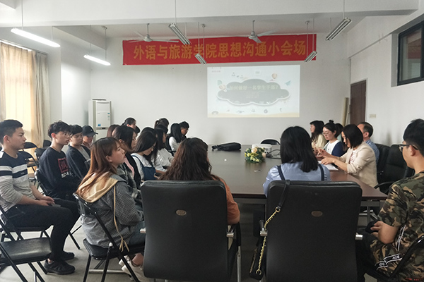 4月25日下午,外语与旅游学院在国际交流中心604会议室开展主题为“如何做好一名学生干部”的思想沟通小会场。分院党总支书记江铭、相关教师、学生会干部和2017级、2018级班干部代表参加了活动。