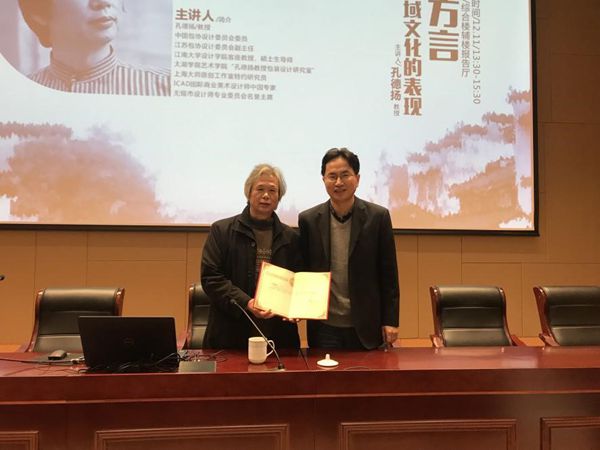 12月11日,江南大学设计学院教授、硕士生导师孔德扬教授的专题讲座在必赢综合楼辅楼报告厅举行。艺术与设计学院院长助理刘姣姣主持,艺术与设计学院党总支罗嘉军书记、孟剑飞副院长及各系部专业教师、学生代表共200余人聆听了孔教授题为“视觉方言——吴文化与视觉设计语言”的讲座。