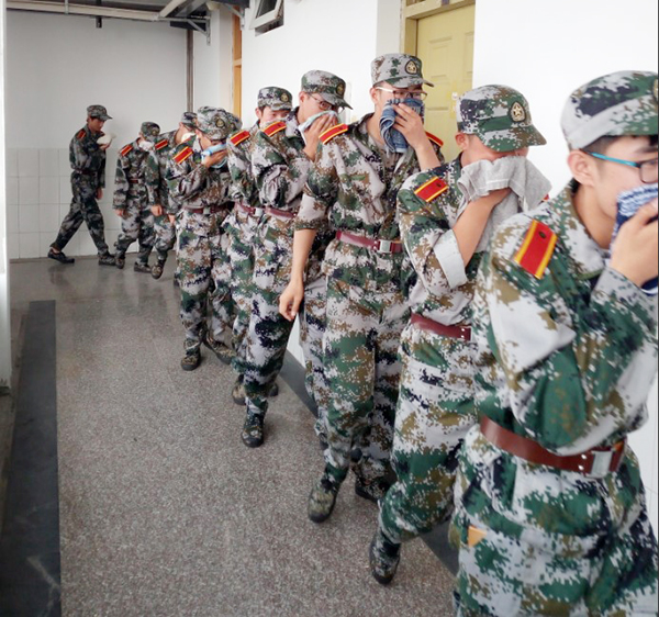 演练开始,学生公寓楼曲园、芳园、梅园、畅园、留园同时发生“火情”,烟雾弥漫,火警警报随即拉响,五幢楼的学生在保卫处工作人员和军训教官的指挥引导下,用湿毛巾捂住口鼻从宿舍东、西两个安全出口快速有序撤离。约5分钟左右,所有参加应急演练人员全部安全撤离“火灾”现场。