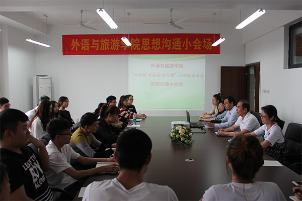 为弘扬中华民族优良传统,促进学生养成良好的行为习惯,5月24日下午,外语与旅游学院在学院会议室开展“好思想 好品行 好习惯”文明礼仪养成思想沟通小会场。外语与旅游学院党总支书记江铭、学工办辅导员、各班学生代表参加了此次思想沟通活动。