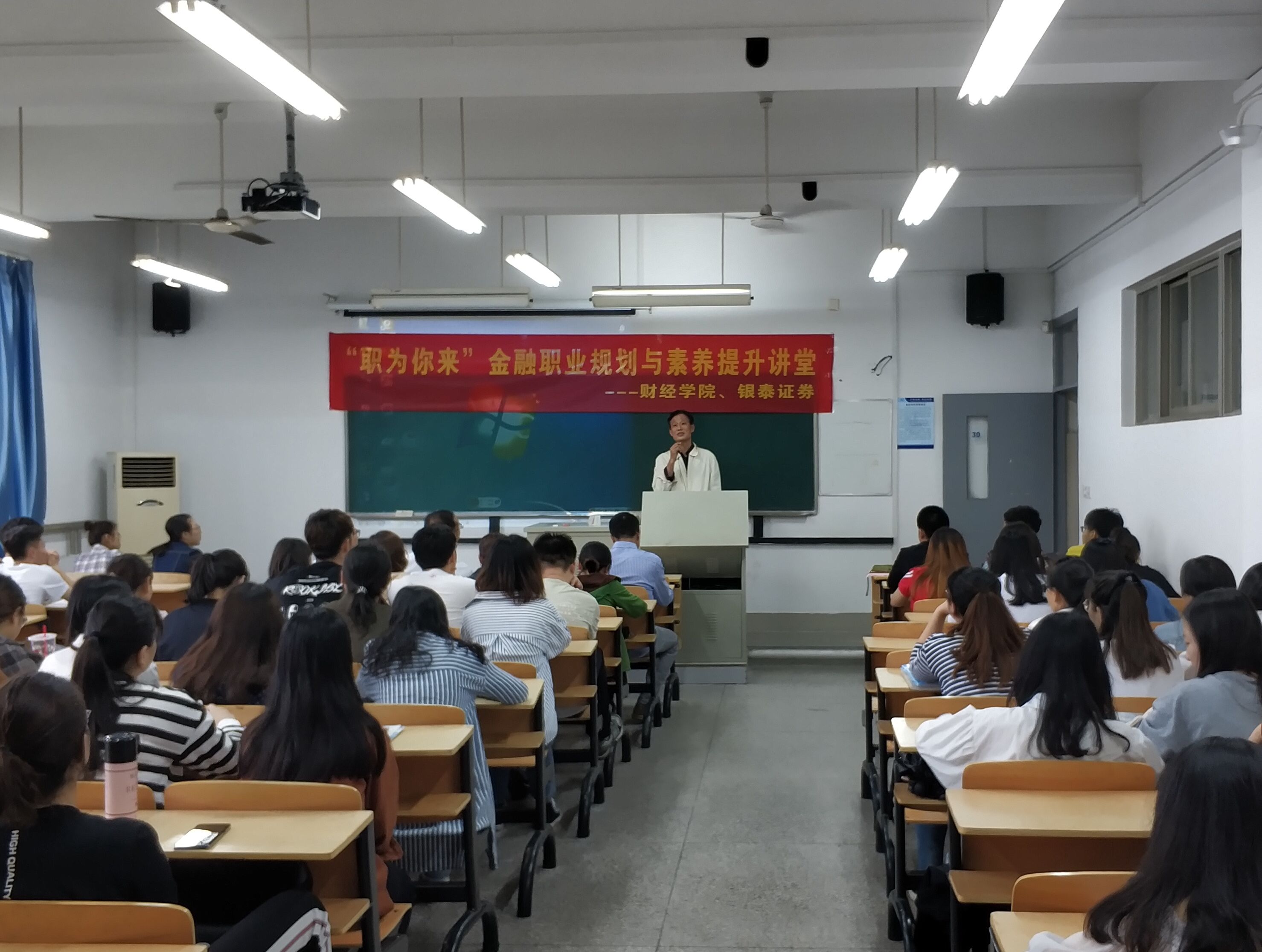 5月22日,财经学院“职为你来”金融职业规划与素质提升讲堂在明德楼C301开讲。银泰证券股份有限公司江苏分公司总经理王正洋担任主讲嘉宾,分院相关专业教师、辅导员以及金融、财会专业80名同学参加了本次活动。