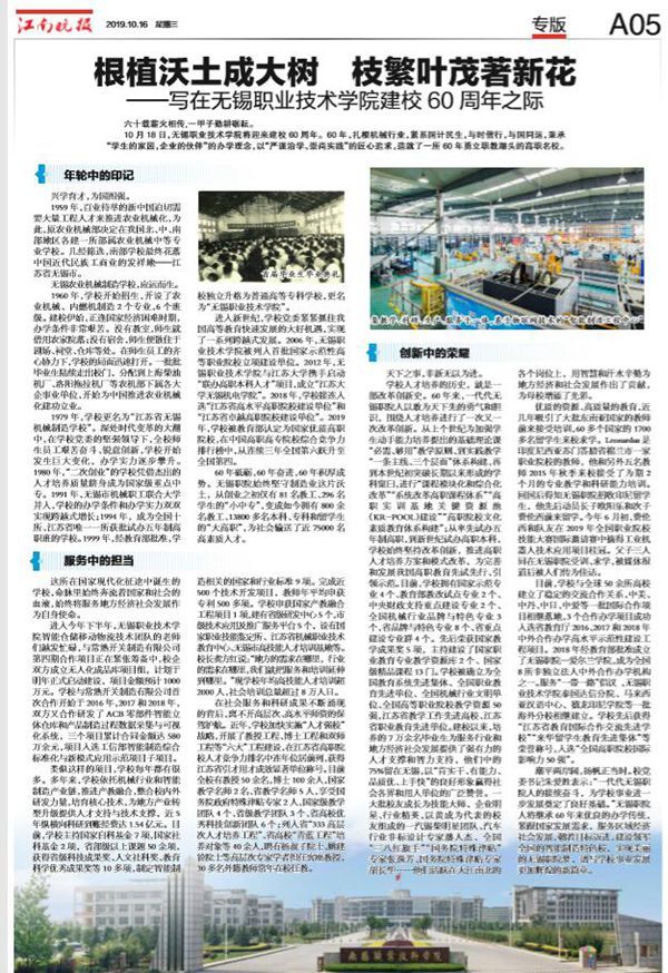【江南晚报】根植沃土成大树 枝繁叶茂著新花——写在无锡职业技术学院建校60周年之际