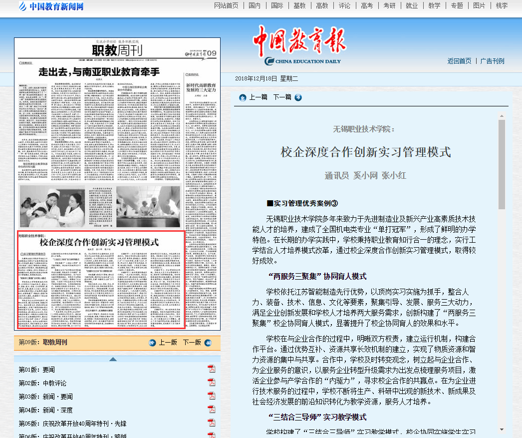 【中国教育报】无锡职业技术学院:校企深度合作创新实习管理模式