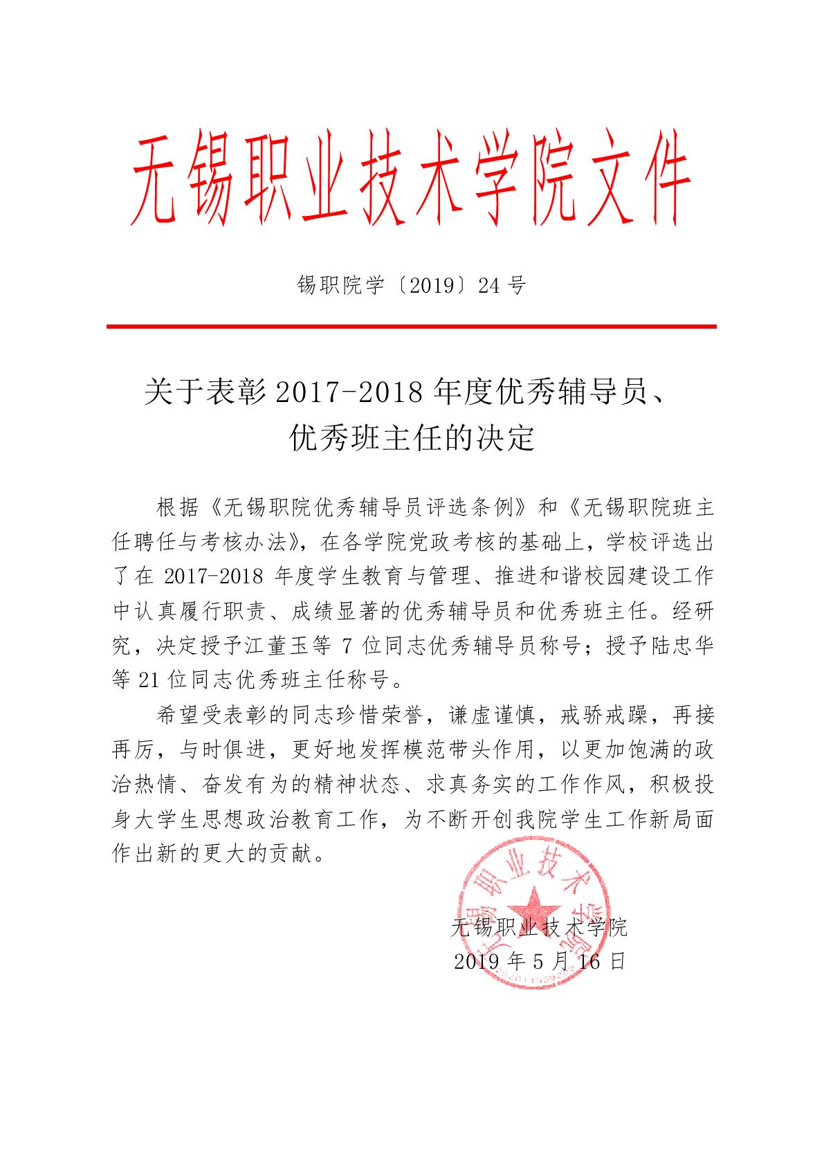 关于表彰2017-2018年度优秀辅导员、优秀班主任的决定