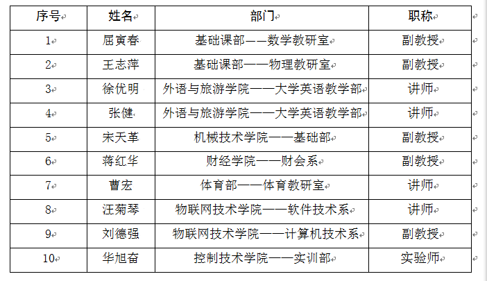 根据锡职院质〔2016〕9号《无锡职业技术学院学生最喜爱的教师评选方案》,质控部、教务处、学工处、人事处等部门联合组织了2016-2017学年学生最喜爱的教师评选,经学校教学工作委员会会议评选、校领导审批,确定2016-2017学年获奖名单如下(见附表),现予公示,公示时间为2017年9月1~5日。 如有不同意见,可于9月5日前向监察处、质控部反映,电话:81838836、81838875。 质量监督与控制部 2017年9月1日 附表 2016-2017学年学生喜爱的教师名单(排名不分先后)