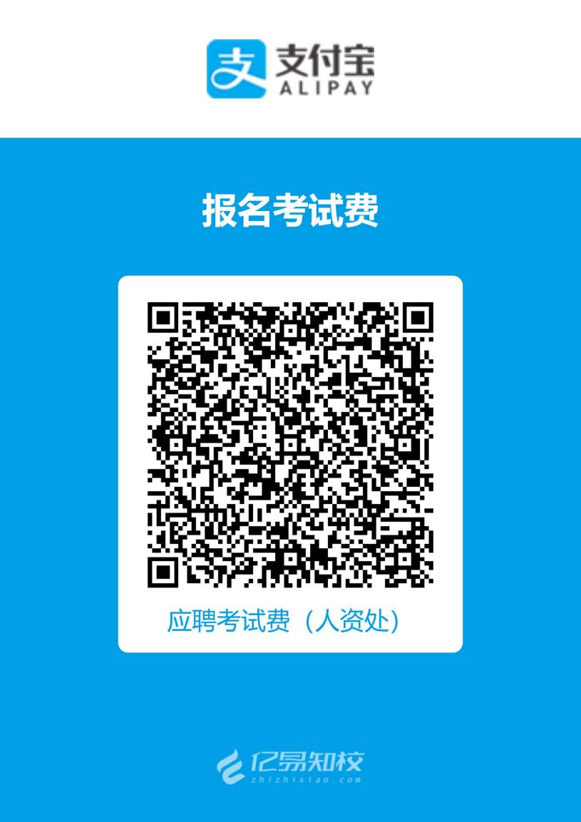 请通过初审的应聘人员使用支付宝扫下方二维码缴纳报名费100元,缴费截止时间为6月3日下午15:00。通过初审并且完成缴费确认的人员,即报名成功,若未按要求缴纳报名费视为报名无效。报名成功后,因个人原因不能参加考试考核,报名费用一律不退。