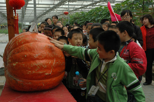 生态植物园里种出的210斤重的大金瓜,吸引了无数游客驻足欣赏